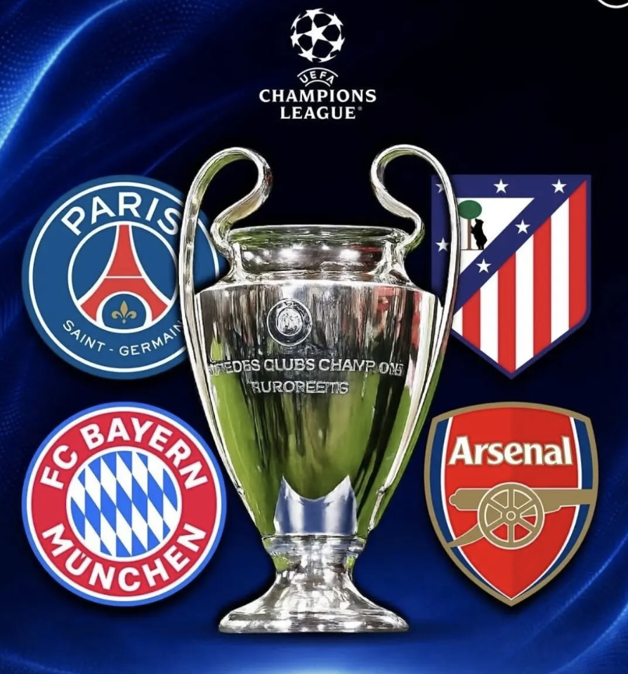 欧冠四强分别为:阿森纳(英超)、马德里竞技(西甲)、拜仁慕尼黑(德甲)、巴黎圣日耳曼(法甲)。阿森纳在主场 0 比 0 战平葡萄牙体育队,最终以总比分 1 比 0 晋级半决赛。